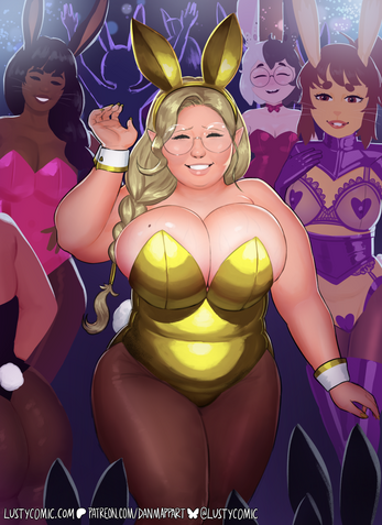 Lusty's Aunty Bolga dresses up for the Bunnyfolk's Equinox festival, in a golden bunnysuit that barely covers her outrageous curves!